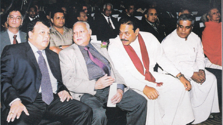 L–R: MP Mahinda Samarasinghe, DHS Jayawardena, Prime Minister Mahinda Rajapaksa, and Minister Nimal Siripala de Silva