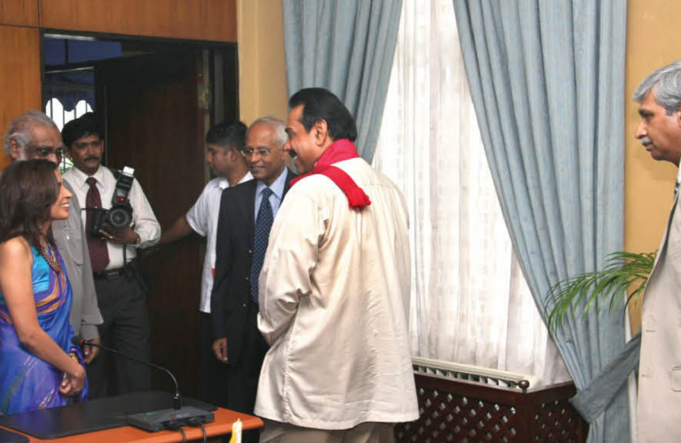 (L-R) Glenda Partipan with President Rajapaksa whilst Lalith Weeratunga looks on