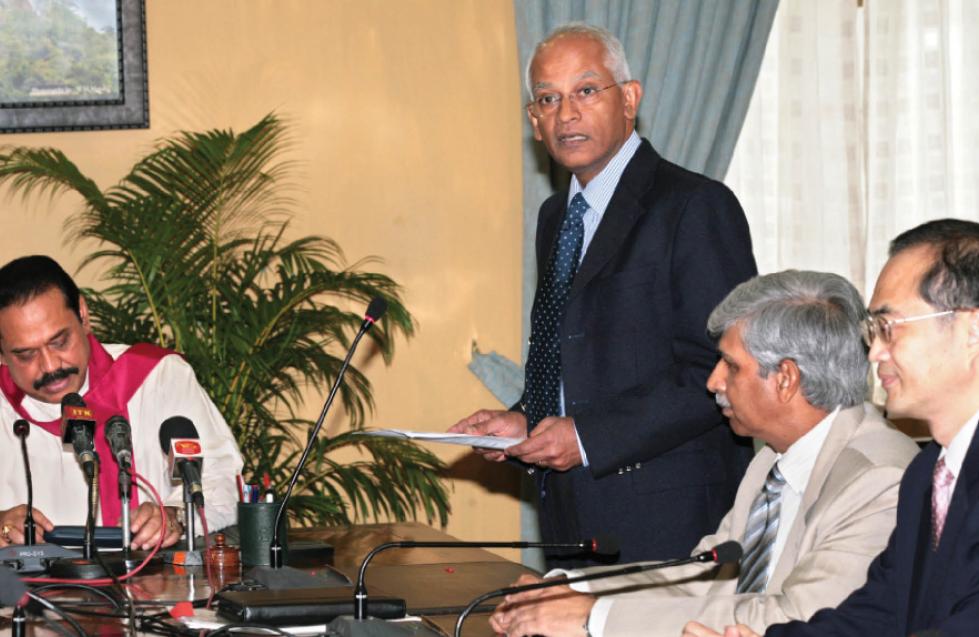 (L-R)Prof G L Pieris, the venerable Thero, Keith Bernard, Mathi K Partipan and President Rajapaksa