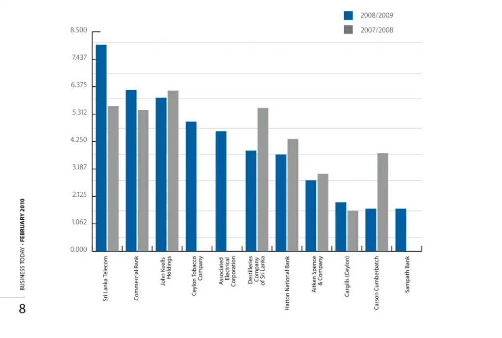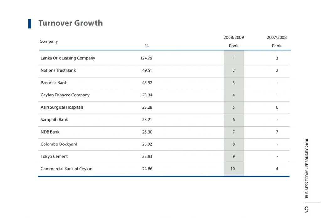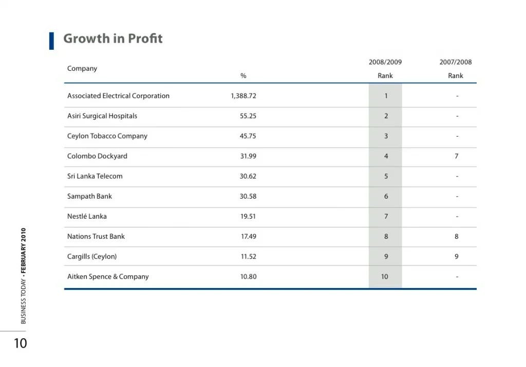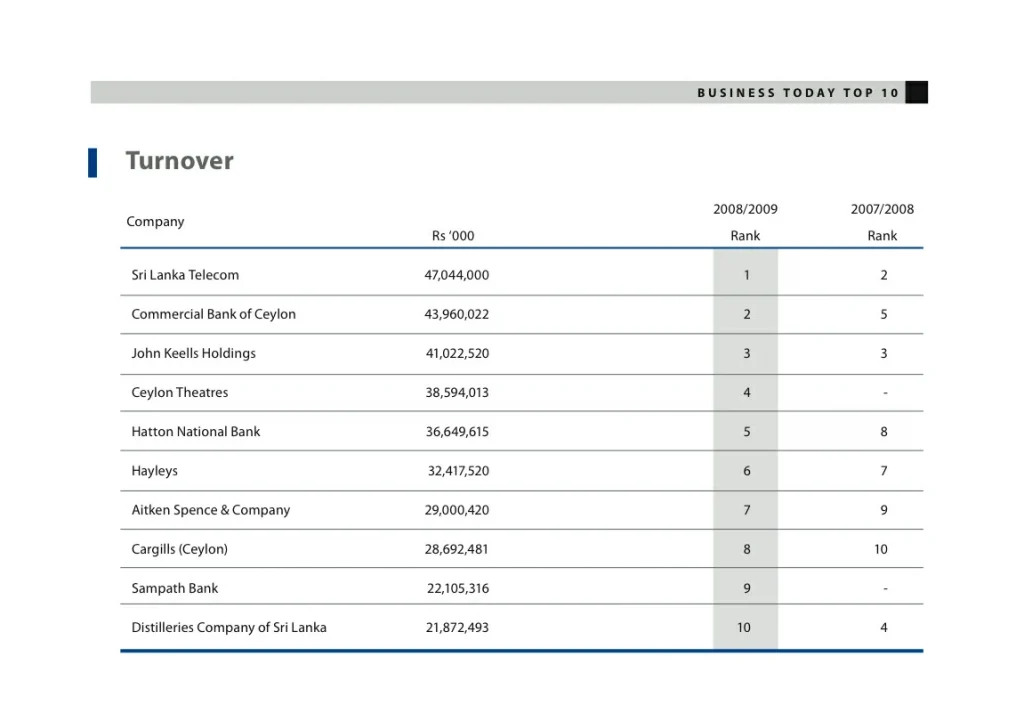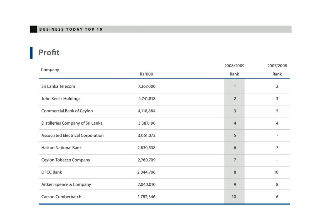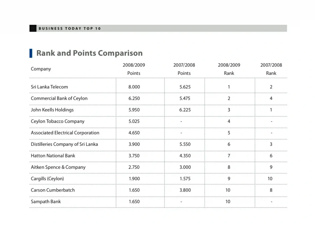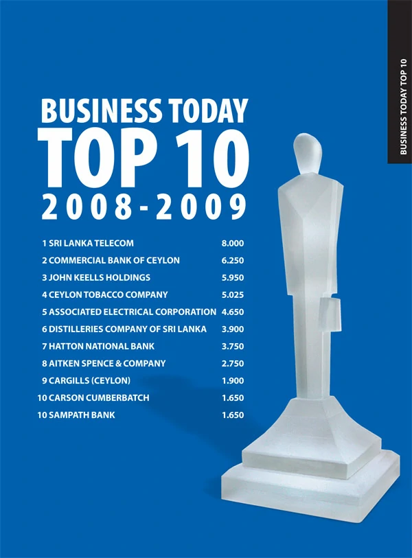 Business Today true to its reputation as the magazine of the corporate world has since 1998 annually conducted its own survey of top corporate performers and recognised those who have performed exceptionally and been the pillars holding the Sri Lankan economy through turbulent times. The ranking is strictly based on published financial information of companies listed on the Colombo Stock exchange.