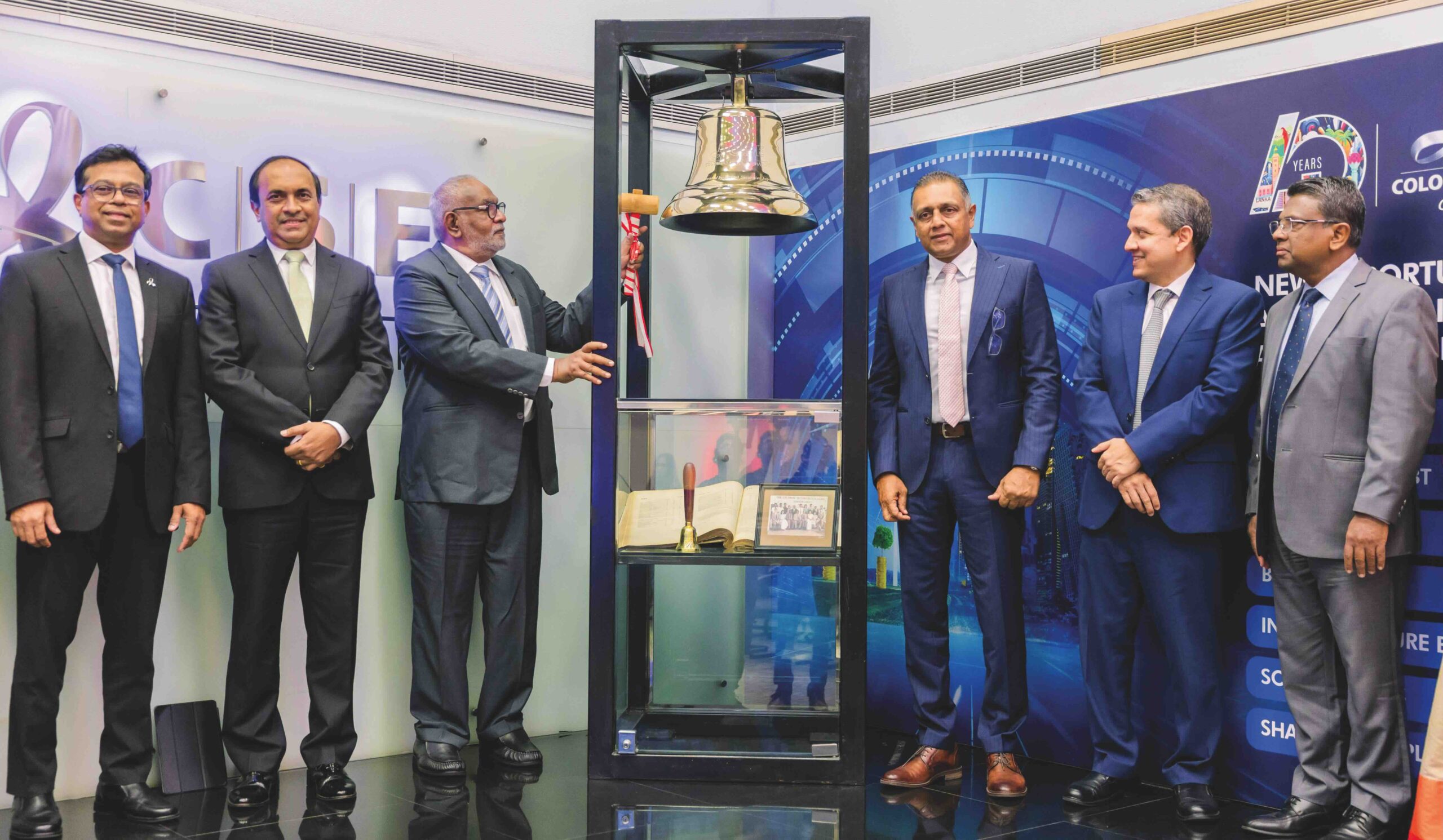 J. Durairatnam, Chairman, DFCC Bank ringing the bell at the CSE in the presence of (from L–R): Sujeewa Peiris, Director CSE; Rajeeva Bandaranaike, CEO, CSE; Thimal Perera, CEO, DFCC Bank; Shamindra Marcelline, Deputy CEO, DFCC Bank; and Prins Perera, Senior Vice President Treasury, Wholesale Banking, and Investment Banking, DFCC Bank.