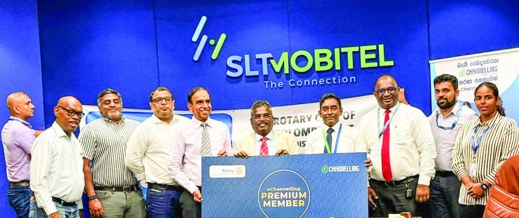 L–R: representing the Rotary Club of Colombo West, Shuvo Hridayesh, Secretary, Suren Karunakaran, Director – Club Services, Haroon Careem, Director – Image and PR, Arunasalam Balraj, Immediate Past President, and K. P. Nagaraja, President, with Imantha Wijekoon, CEO, SLT-MOBITEL, Mohan Ajitkumar, Head of Business Development and Revenue, Sandun Randen