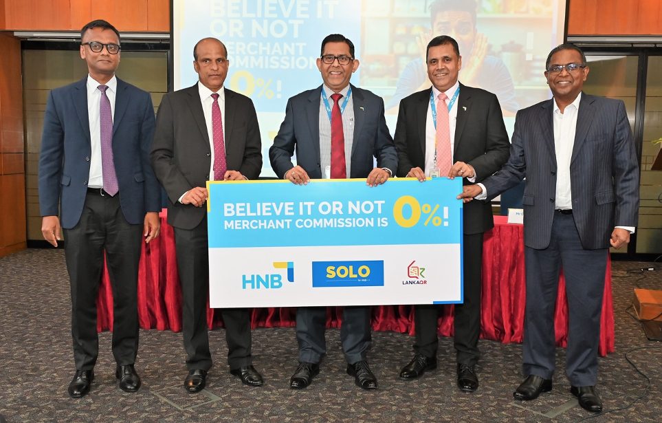 Settlements, Central Bank of Sri Lanka; Damith Pallewatte, Managing Director/CEO, HNB; Sanjay Wijemanne, Chief Operating Officer, HNB; and Channa de Silva, CEO, LankaPay present a symbolic tonic officially announcing zero percent merchant commission for digital transactions via HNB SOLO, reinforcing efforts to drive digital payment adoption in Sri Lanka.
