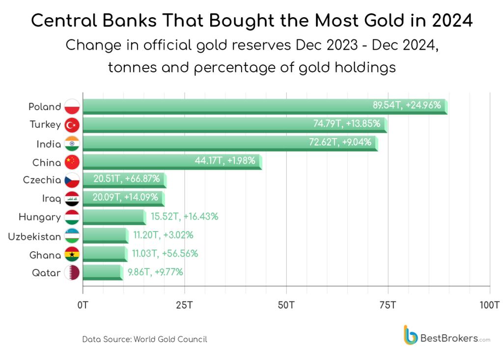 With gold continuing to make headlines into 2025, the BestBrokers team set out to research the demand for gold by central banks in 2024. We gathered data from the World Gold Council (WGC) and identified the countries that increased their gold reserves the most last year, as well as those nations that sold the most of the precious metal.