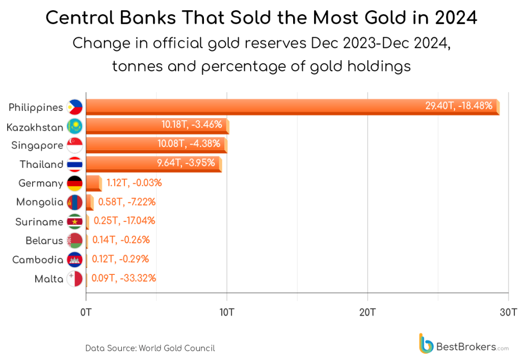In 2024, the Central Bank of the Philippines bought and sold gold as part of its standard bank operations (as all banks do). However, the amounts it sold exceeded its purchases, resulting in a decrease in its official gold reserves by 29.4 metric tonnes. These sales position the Philippines as the largest net gold seller last year, indicating a strategic shift in its management of reserves.