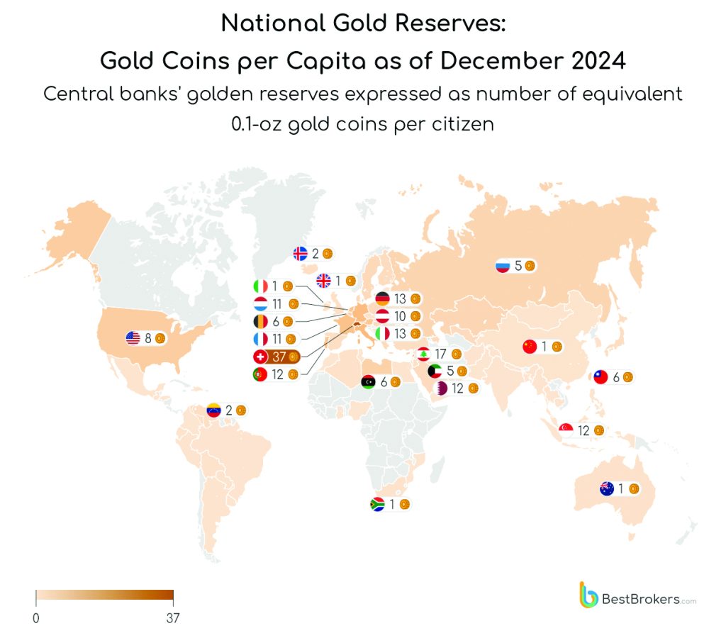 The United States, for instance, which has the largest amount of gold in its reserve, ranks 12th in gold per capita, having nearly 24 grams of gold per citizen. This is the equivalent of 0.77 troy ounces of gold or nearly eight small gold coins. The coins we used for this comparison contain 0.1 gold troy ounces and weigh approximately 0.11 troy ounces (3.39 g). Switzerland, on the other hand, has the seventh largest gold reserve in the world. When its nine million population is considered, however, it is the country with the most gold per capita, with 115 grams or 3.7 ounces per person. In other words, Switzerland has roughly 37 gold coins per citizen, the most of any other nation in the world. Lebanon ranks second in terms of gold per capita with roughly 17 gold coins per person, followed by Italy and Germany, each having about 13 one- tenth-ounce gold coins per citizen. This is quite interesting, considering the two have not expanded their gold reserves for decades. Other per-capita gold-rich nations include Singapore, Qatar, and