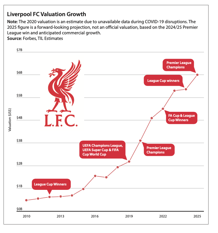 Since then, Liverpool’s valuation has soared to an estimated USD six billion following the club’s 20th Premier League title win in April 2025. It’s important to note that this USD six billion figure is a forward-looking projection based on anticipated future growth and not an official sale price, according to The Investment League.