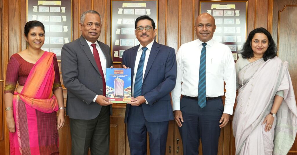 Prof. Narada Fernando, People’s Bank Chairman, presented the Bank’s flagship publication, The Economic Review, to Dr. Nandalal Weerasinghe, Governor of the Central Bank of Sri Lanka (CBSL). Also present were Clive Fonseka, Chief Executive Officer/General Manager, People’s Bank; Nilmini Premalal, Deputy General Manager—Payments & Cards/Strategic Planning, Performance Management and Research (Acting); and Patalie Liyanaarachchi, Co-Editor, Economic Review.