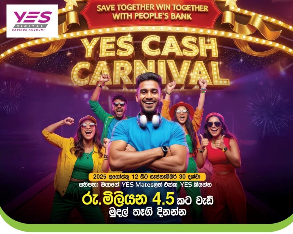 To enter the Share and Win draw, share the post on People’s Bank’s Facebook with #yescashcarnival and submit a screenshot at peoplebank. lk/yes-cash-carnival. Ten winners will be selected every five days for 10,000 rupee prizes, totaling 100,000 rupees. For the Grand Prize, deposit 50,000 rupees into your Yes Savings Account by September 30, 2025, and maintain it until January 1, 2026. Twenty-five customers can win 100,000 rupees each.