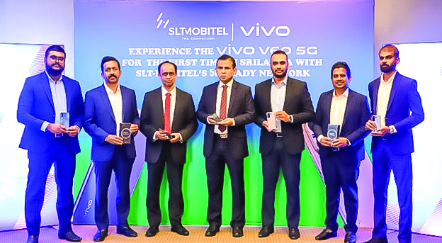 L–R: Chathura Liyanage, Brand Manager, vivo Sri Lanka, Prabhath Dahanayake, Chief Marketing Officer, SLT-MOBITEL, Jeewapadma Sandagomi, Chief Officer – Supply Chain Management, SLT-MOBITEL, Sudharshana Geeganage, Chief Operating Officer, Mobitel, Gihan Sanketh Nanayakkara, General Manager, vivo Sri Lanka, Lahiru Ekanayake, Senior Key Account Manager, vivo Sri Lanka, and Dilshan Bandara, Deputy Sales Manager, vivo Sri Lanka at the official launch of vivio V60 5G in collaboration with SLT-MOBITEL.