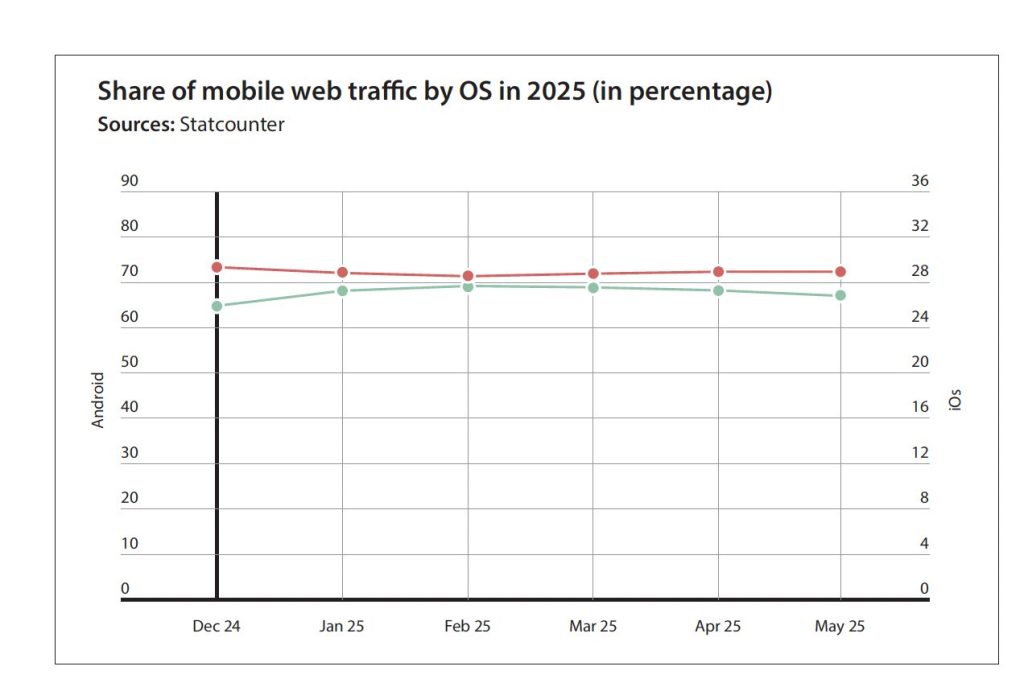 Statistics show iOS hit a 26.9 percent mobile web traffic share last month, slightly up from 26.04 percent at the end of 2024. Far behind, Samsung ranked third with just 0.2 percent, followed by KaiOS (0.02 percent) and Linux (0.01 percent).