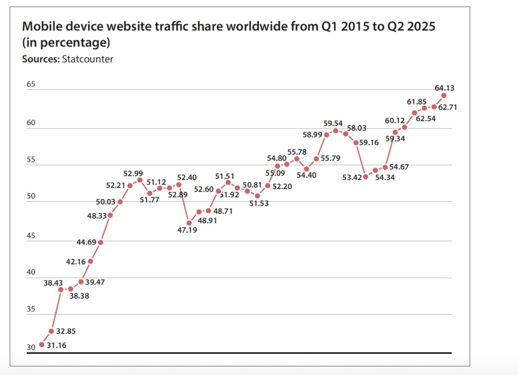 With more people than ever turning to their smartphones to browse the web, mobile’s share of web traffic jumped to 59.3 percent in Q1 2024. The steady growth continued ever since, reaching 64.1 percent in Q2 2025, and marking eight consecutive quarters of growth, the longest run since the 2016 smartphone boom.