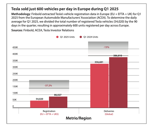 The sales, which average only 600 per day, were 37.2 percent lower than in Q1 2024, when 86,027 – 945 per day – were registered, according to data Finbold retrieved from Tesla and the European Automobile Manufacturers Association (ACEA).