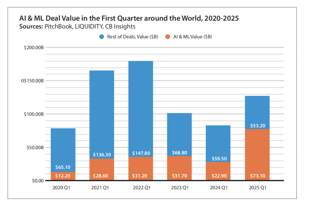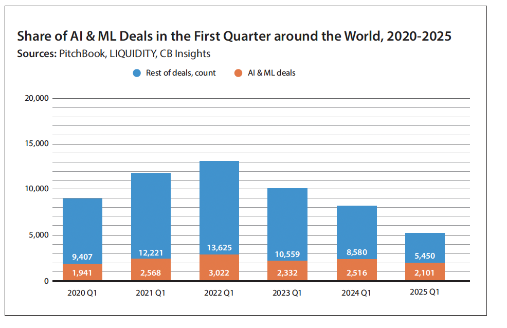 The story of the startup, which reached a valuation of USD 1 billion at its peak, can now be used as a reminder to investors to better research and audit the startups they are funding, especially ultra-ambitious ones with bold claims and in promising industries such as machine learning, artificial intelligence and deep tech. But the drop in the number of VC deals in AI startups is not just a reflection of investors’ wariness; it is mirroring a wider downward trend in venture capital funding. In Q1 2025, AI deals dropped 16.5 percent to 2,101, while the decline in all venture capital deals was much more significant.