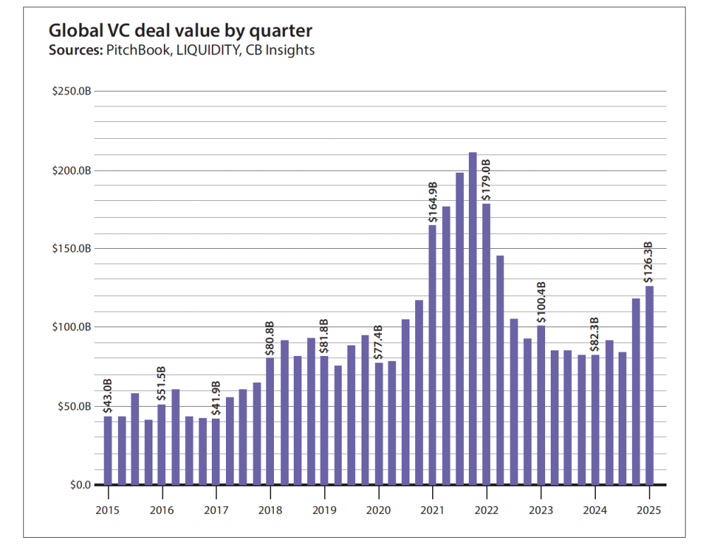 Venture capital deal volume was relatively low this quarter, with 7,551 reported VC-backed deals. This represents the lowest reported quarterly deal count in over ten years. Despite the decline in volume, the funding in Q1 2025 was the highest since 2022, with VC firms investing USD 126.3 billion in startups worldwide.