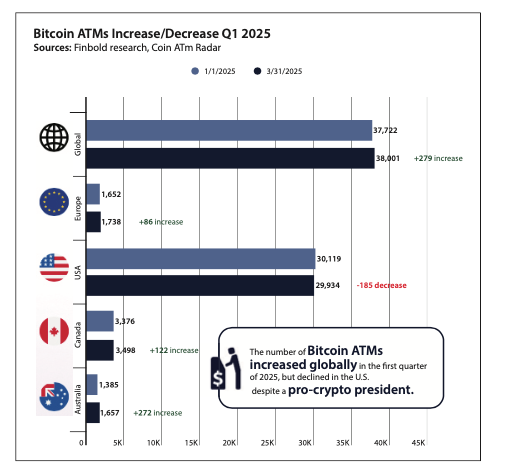 At the start of 2025, there were 30,119 Bitcoin ATMs across the country. By the end of Q1, that number had dropped by 185 to 29,934, according to data cited in Finbold’s Q1 2025 Cryptocurrency Market Report.