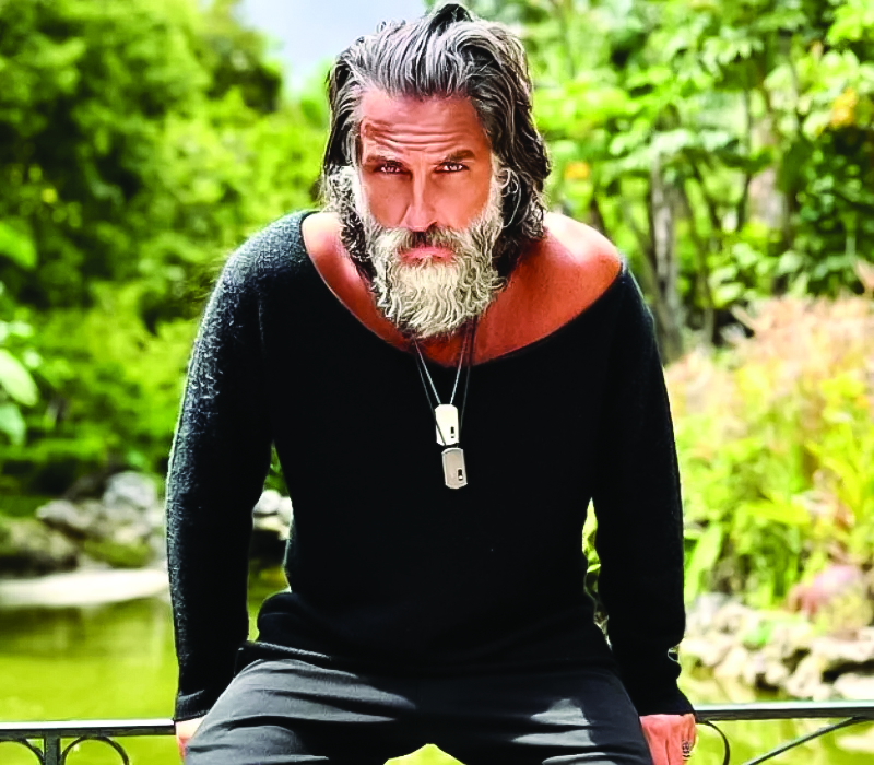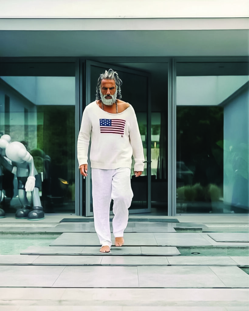 The jeans, faded and perfectly torn, project raw masculinity and comfort, while the sweater—draped effortlessly off one shoulder—brings an unexpected softness and sensuality. Combined with his rugged silver beard, sun-kissed skin, and statuesque posture, the ensemble reads like a modern-day god walking through the streets of Saint-Tropez.